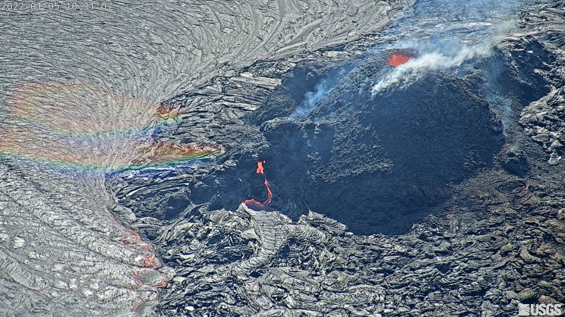 During recent multi-day pauses in the ongoing Kīlauea summit eruption, a small portion of the Halemaʻumaʻu lava lake has consistently remained active: a small, ovular lava pond just north of the briefly dormant western fissure. This photo of the lava pond was captured on Thursday, December 30, through the lens of a laser rangefinder device, and the western fissure is just out of frame to the left. Measurements indicated that the lava pond measured approximately 30 meters (98 feet) from end to end at that time. On previous occasions when more vigorous eruptive activity resumed, new breakouts of lava from the fissure and upwelling lava from the pond have reactivated the nearby crusted-over lava lake (lower right). A vertical levee, standing approximately 4 meters (13 feet) tall, bounds the lake and far edge of the pond; distinctive layering in the levee wall marks earlier lava levels when the lake was more full. USGS photo by M. Zoeller.
